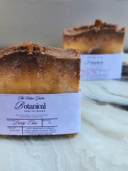Macadamia Nut Oil, Coconut Oil, Shea Butter, Mafura Butter, Castor Oil (Hexane Free), Sodium Hydroxide, Salicylic Acid, Lactic Acid, Propylene Glycol, Rhassoul Clay, Kaolin Clay, Clove Essential Oil, Cinnamon Essential Oil, Vanilla, Nutmeg Essential Oil, Dirty Chai Blend (Coffee Beans, Ginger Powder, Cinnamon)